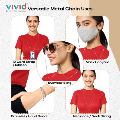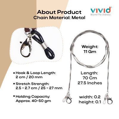 PRODUCT DETAILS: Material- Metal || Color- Silver || Close type- Silicone Rubber || Lock- Metal Hook || Chain Standard Length- Approx. 70 cm || Chain Use for- Mask, Reading Eyeglasses, Bracelet, Necklace, Key Chains, Pendant, Eyewear, Spectacle, Swimming Goggles, Sports Glasses, and More || Suitable for- Men, Women, & Children.