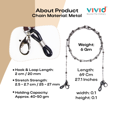PRODUCT DETAILS: Material- Metal || Color-grey || Close type- Silicone Rubber || Lock- Metal Hook || Chain Standard Length- Approx. 70 cm || Chain Use for- Mask, Reading Eyeglasses, Bracelet, Necklace, Key Chains, Pendant, Eyewear, Spectacle, Swimming Goggles, Sports Glasses, and More || Suitable for- Men, Women, & Children.